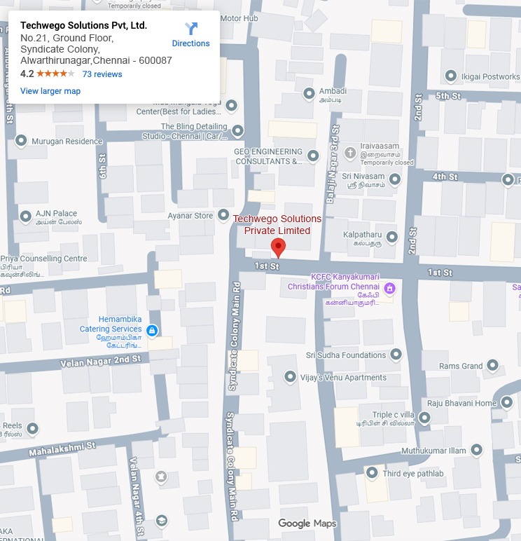 Techwego Solutions Pvt, Ltd.B1110, Navins whiteberry, No 443/70,MRH Road, Madhavaram, Chennai, Tamil Nadu, PIN-600060.
